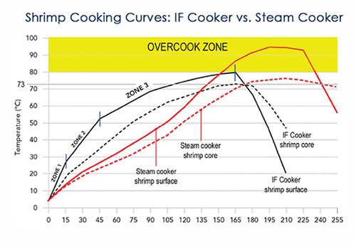The OctoFrost™ IF Cooker is the latest technological innovation in the shrimp processing industry. It uses the OctoFrost™ patented 3-temperature zones which guarantees shrimp’s core temperature to reach the food safety temperature of 73°C while surface stays below 80°C. This means that overcooking is avoided and highest yield possible is achieved. Furthermore, the unique rain shower system guarantees the quickest heat transfer, allowing for accurate temperature control within 0.2°C of the set temperature.